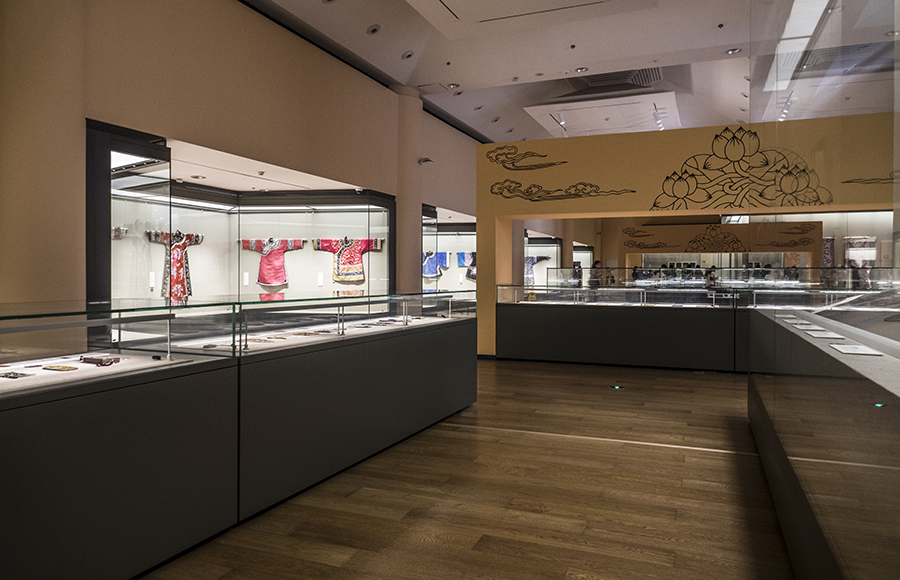 乐鱼在线平台艺术博物馆收藏有织绣四千六百余组件,以明清及近代藏品居多,锦缎、纱罗、丝绒、刻丝等具有代表性的优秀品种应有尽有。本次展览中织绣藏品绝大多数来自于原中央工艺美术学院的旧藏,包含有明代刻丝凤穿牡丹团花,清代“无量寿尊佛”刻丝佛像、红纱地戳纱金玉满堂女氅衣、蓝地刻丝云龙立水长袍等名品杰作。