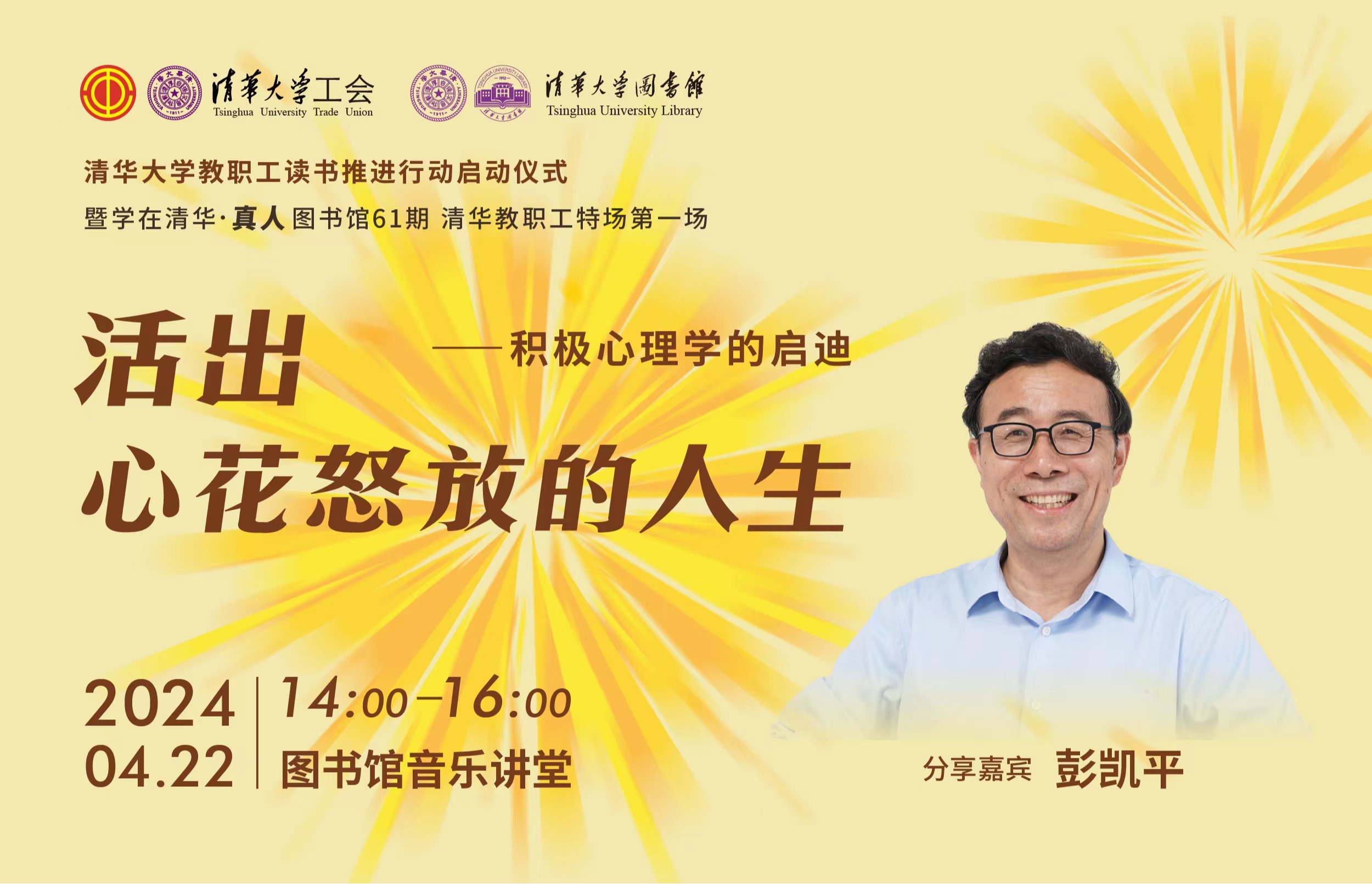 乐鱼在线平台教职工读书推进行动启动仪式暨“学在清华·真人图书馆”61期活动特别邀请彭凯平老师以“活出心花怒放的人生——积极心理学的启迪”为主题,从积极心理学的角度,帮助我们掌握情绪调节的多种方法,创造幸福美好的生活体验。